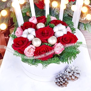 Новогодняя романтика - коробка с розовыми розами и эустомой