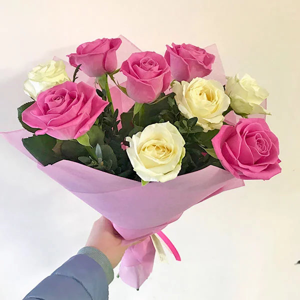 Роза белая (кремовая) и розовая 70 см - 9 шт , упаковка фетр.