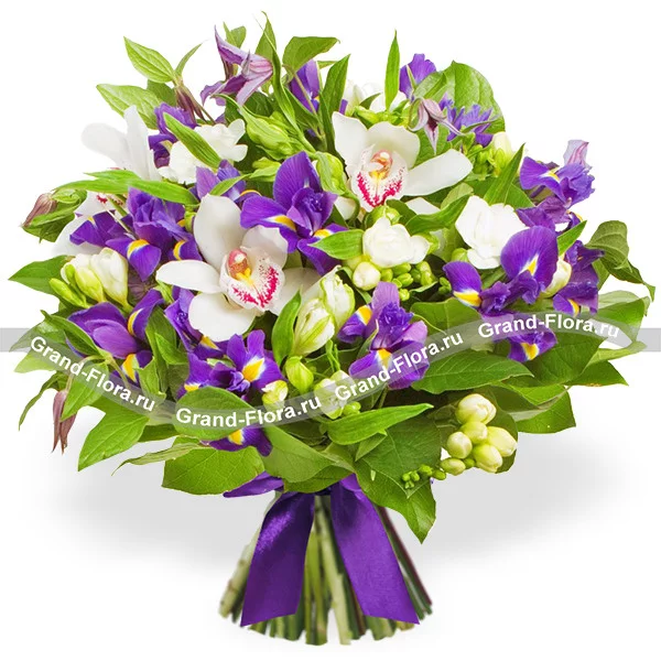 Стандартный: орхидея - 3 шт., ирисы - 11 шт., фрезия - 3 шт., клематис - 2 шт., декоративная зелень, лента.