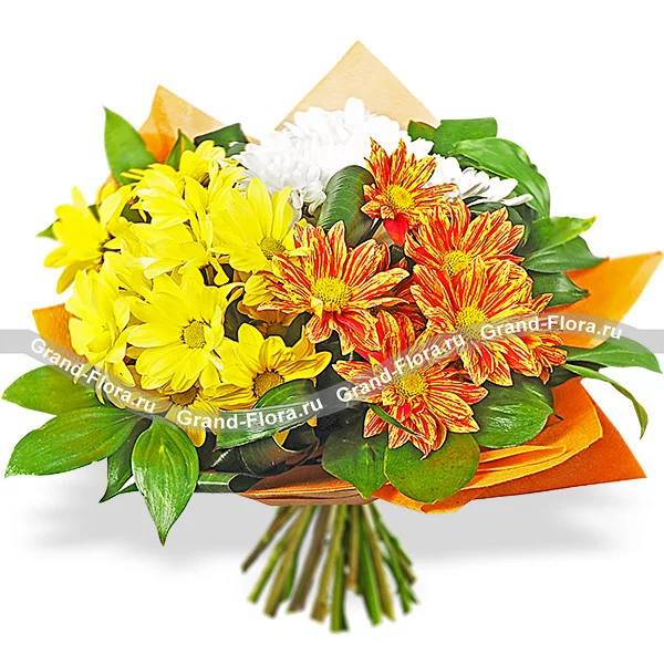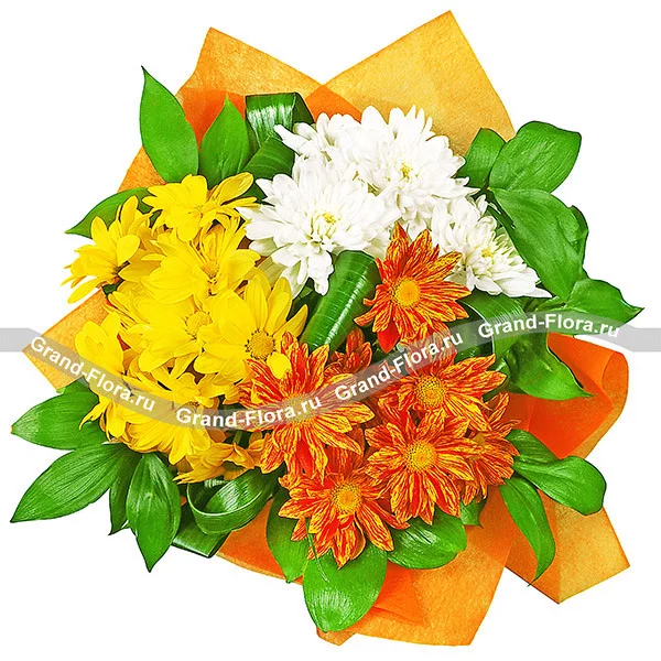 Трудно найти цветок, который был бы так же многогранен, как хризантема. Чарующая прелесть желтого, белого и оранжевого цветов в комбинации с зелеными веточками придется по душе солнечным, позитивным натурам. Хризантемы олицетворяют в букете восхищение и преданность. Такая дизайнерская композиция станет отличным поводом разделить торжество вместе с именинником, или лишний раз сказать маме, о том, как вы сильно ей дорожите.